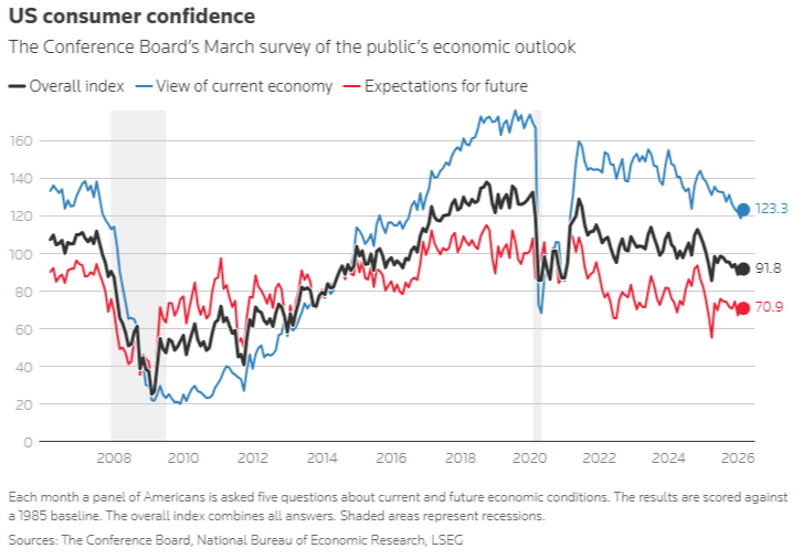 Consumer confidence captured some of that tension in March. The Conference Board’s index rose modestly to 91.8, but the details beneath the surface were mixed. The present situation index improved (123.3), while the expectations index fell to 70.9, a level that historically reflects caution about the future. In practical terms, households seem to be saying two things at once: conditions today are still manageable, but the road ahead looks less certain. The consumer has not rolled over, but rising fuel prices, softer hiring, and sticky inflation are all moving in the wrong direction at the same time.