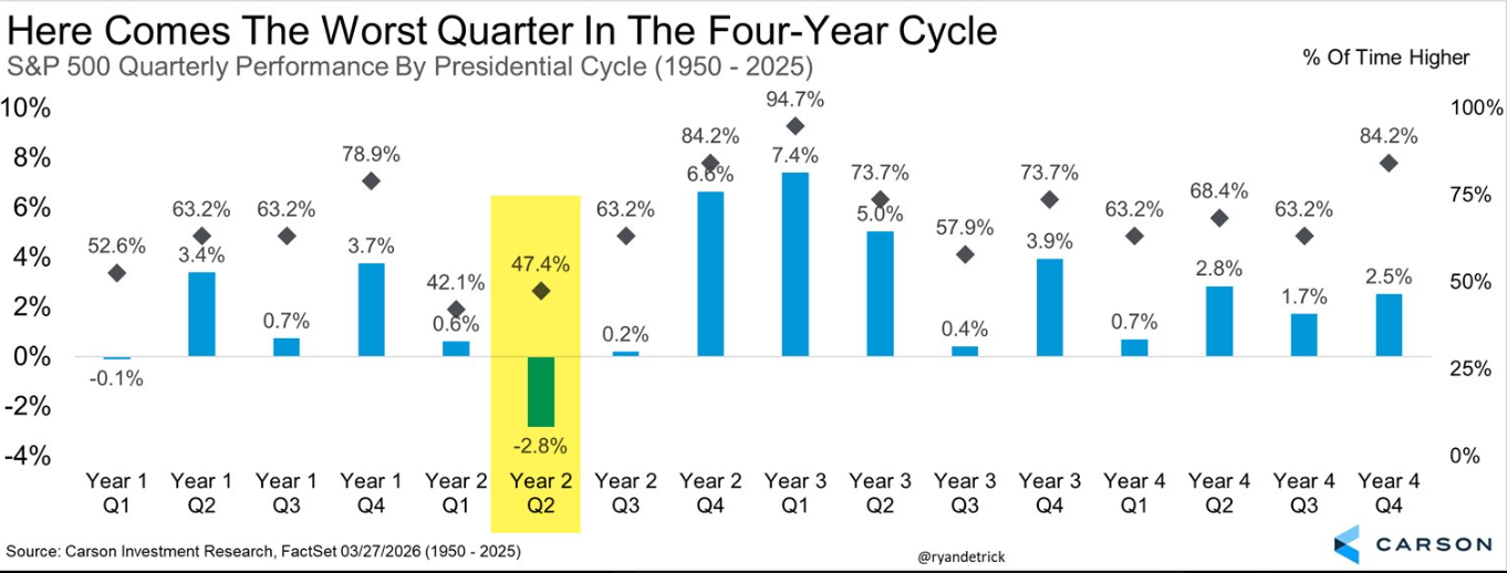 Where does that leave us as we move into the second quarter? In my view, the path of oil matters more than almost anything else right now. If the conflict de-escalates and energy prices begin to normalize, some of the inflation pressure may fade faster than feared, the consumer may remain resilient, and the Fed could retain flexibility. If oil stays elevated or moves higher, the spill over into inflation expectations and household budgets may become much more problematic. In that case, the Fed could remain constrained, the consumer could slow more meaningfully, and growth could come under additional pressure. There is another layer to add here when viewing the historical pattern for the second and third quarters in the second year of a presidential term, as mid-terms approach. As the chart indicates below, the 2nd quarter of the second year of the presidential term has only been positive 47% of the time and on average the market is lower by 2.8%. The 3rd quarter has also been soft, historically, with the market up 63% of the time and +0.20% on average. However, that trend breaks after mid-terms with the 4th quarter positive 84% of the time with an average gain of 6.6% and continues into the third year of the presidential term.