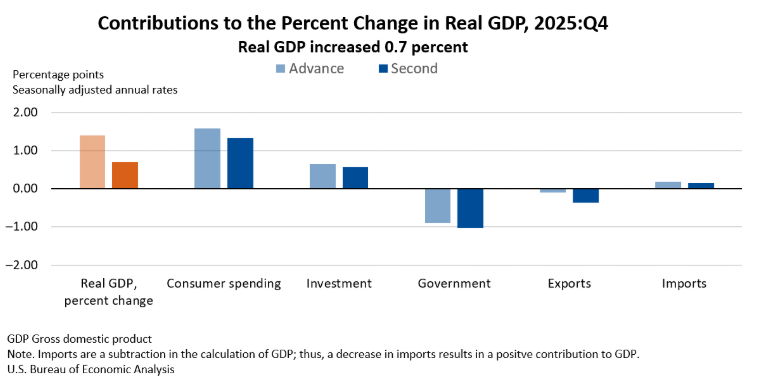 Economic growth had already slowed before the March energy shock. The second estimate for fourth-quarter 2025 GDP showed growth at an annualized rate of just 0.7%, down sharply from 4.4% in the third quarter. That does not mean a recession is here, but it does mean the economy entered this quarter with less momentum than many investors may have realized. We should not forget the government shutdown in the 4th quarter as this adversely impacted GDP, to the tune of 1.5% annually, according to Brookings. But an energy shock landing on top of slower growth is precisely why markets have become so sensitive to oil. It is one thing for higher energy prices to arrive when growth is running hot. It is another when the economy is already cooling. The chart below highlights just how important consumer spending has been in propping up GDP.