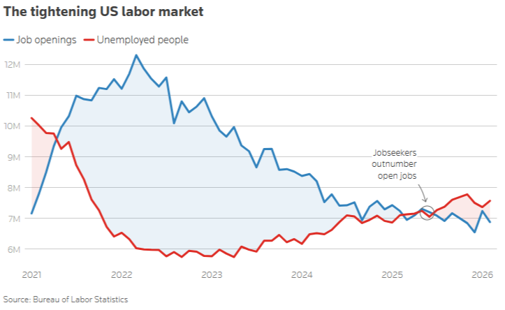 That tension places the consumer squarely at center stage. The labor market is no longer as strong as it was a year ago, even if it has not broken. February non-farm payrolls fell by 92,000 and the unemployment rate held at 4.4%. Job openings dropped to 6.882 million in February, while hiring declined to 4.849 million, the lowest level since the pandemic-era freeze in 2020. This is not a classic recessionary labor market with broad-based layoffs, but it is a softer one, and softer labor conditions reduce the consumer’s margin for error at precisely the time that gasoline and energy costs are moving higher.